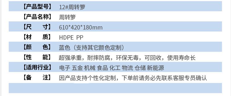 本店產品常規庫存為全新料藍色塑料托盤,周轉箱,周轉籮,化工桶,中空板材及部分高性價比黑色一次性出貨產品。如需要其他顏色請聯系客服對接處理。因產品規格較多,未能全部上至店鋪,如店中沒有您需要的規格尺寸也請聯系客服。希望能解決您的問題,我們竭誠為您服務?。?!