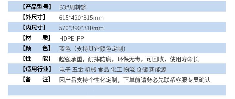 本店產(chǎn)品常規(guī)庫(kù)存為全新料藍(lán)色塑料托盤,周轉(zhuǎn)箱,周轉(zhuǎn)籮,化工桶,中空板材及部分高性價(jià)比黑色一次性出貨產(chǎn)品。如需要其他顏色請(qǐng)聯(lián)系客服對(duì)接處理。因產(chǎn)品規(guī)格較多,未能全部上至店鋪,如店中沒(méi)有您需要的規(guī)格尺寸也請(qǐng)聯(lián)系客服。希望能解決您的問(wèn)題,我們竭誠(chéng)為您服務(wù)!!!