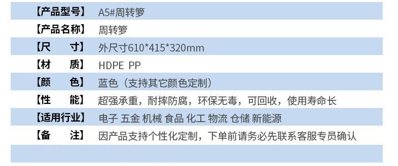 本店產品常規庫存為全新料藍色塑料托盤,周轉箱,周轉籮,化工桶,中空板材及部分高性價比黑色一次性出貨產品。如需要其他顏色請聯系客服對接處理。因產品規格較多,未能全部上至店鋪,如店中沒有您需要的規格尺寸也請聯系客服。希望能解決您的問題,我們竭誠為您服務!!!