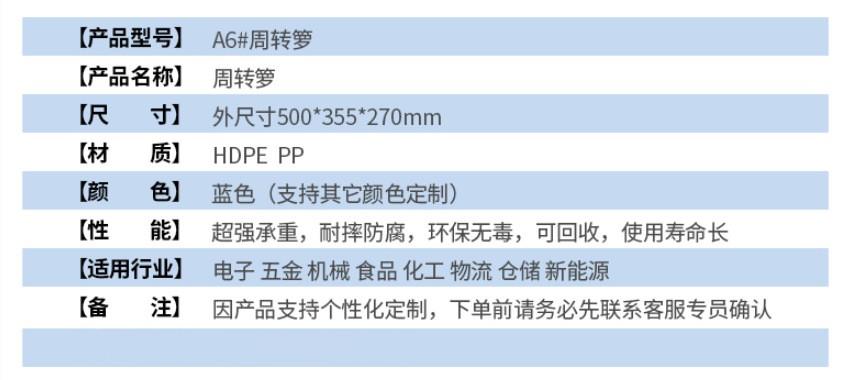 本店產品常規庫存為全新料藍色塑料托盤,周轉箱,周轉籮,化工桶,中空板材及部分高性價比黑色一次性出貨產品。如需要其他顏色請聯系客服對接處理。因產品規格較多,未能全部上至店鋪,如店中沒有您需要的規格尺寸也請聯系客服。希望能解決您的問題,我們竭誠為您服務!??!
