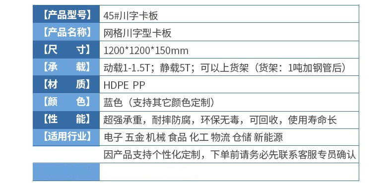 本店產品常規庫存為全新料藍色塑料托盤,周轉箱,周轉籮,化工桶,中空板材及部分高性價比黑色一次性出貨產品。如需要其他顏色請聯系客服對接處理。因產品規格較多,未能全部上至店鋪,如店中沒有您需要的規格尺寸也請聯系客服。希望能解決您的問題,我們竭誠為您服務!!!