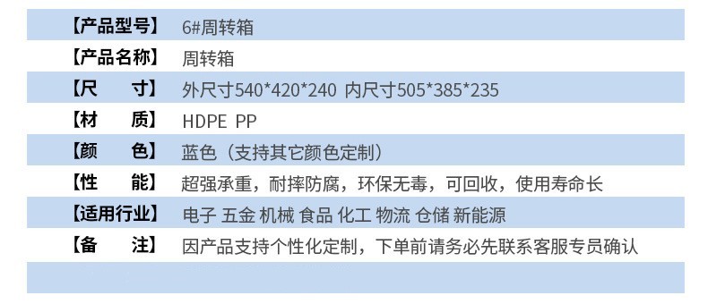 本店產品常規庫存為全新料藍色塑料托盤,周轉箱,周轉籮,化工桶,中空板材及部分高性價比黑色一次性出貨產品。如需要其他顏色請聯系客服對接處理。因產品規格較多,未能全部上至店鋪,如店中沒有您需要的規格尺寸也請聯系客服。希望能解決您的問題,我們竭誠為您服務!!!