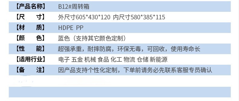 本店產品常規庫存為全新料藍色塑料托盤,周轉箱,周轉籮,化工桶,中空板材及部分高性價比黑色一次性出貨產品。如需要其他顏色請聯系客服對接處理。因產品規格較多,未能全部上至店鋪,如店中沒有您需要的規格尺寸也請聯系客服。希望能解決您的問題,我們竭誠為您服務!!!